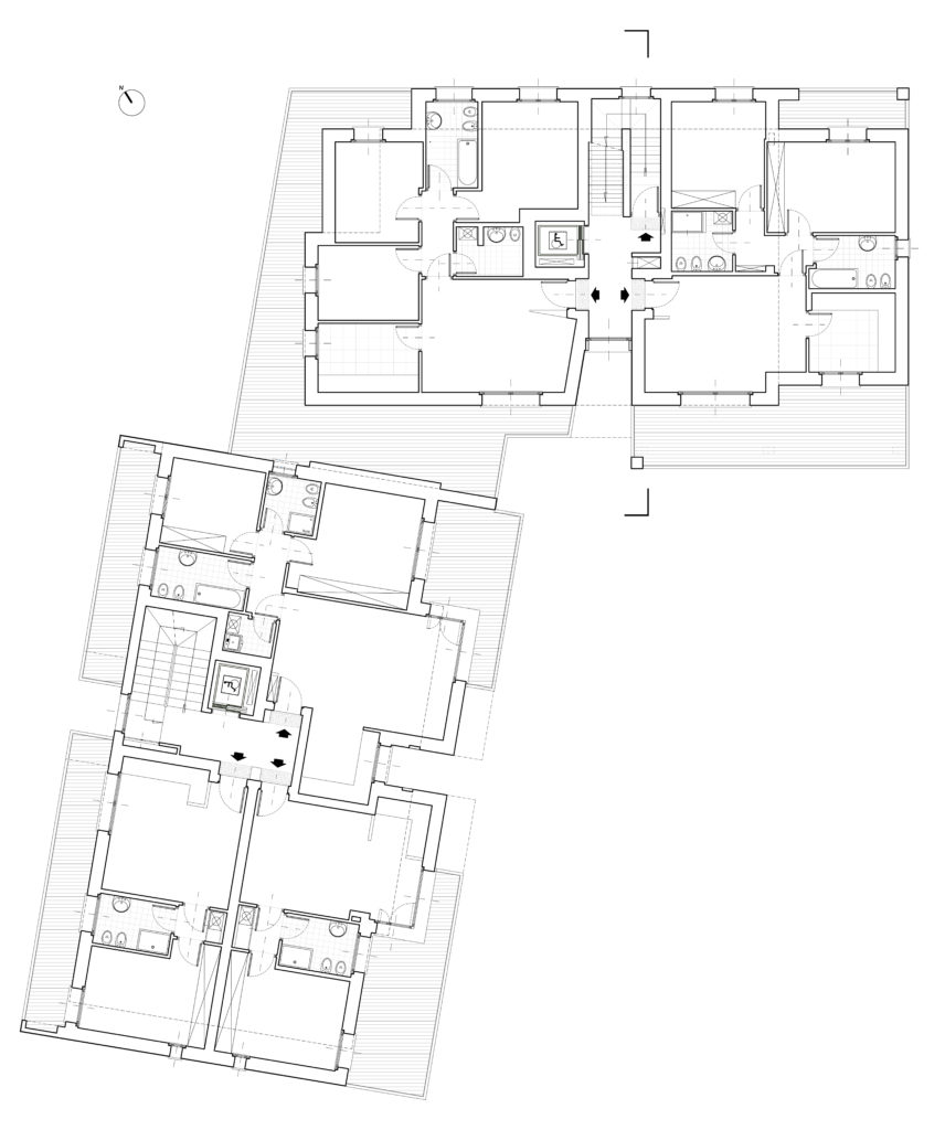 Il nuovo complesso residenziale prevede un piano interrato dove verranno ricavate le autorimesse e i locali accessori di pertinenza alle residenze e tre piani fuori terra collegati verticalmente da due vani scale con ascensore, i quali ospitano i diversi tagli di residenze.